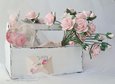 По этому заданию я сделала мини-ящичек для инструментов. Выполнен с нуля из чипборда 2мм толщины, покрашен коричневой и белой красками. На некоторые уголки нанесла дополнительно кракелюр белого цвета, в ящичек посадила букетик из роз и бутончиков, перевязанный рафией. Сердце сшила из хлопковой ткани, вовнутрь добавила немного синтепона для объема. Конвертик из бумаги PrettyPapers.