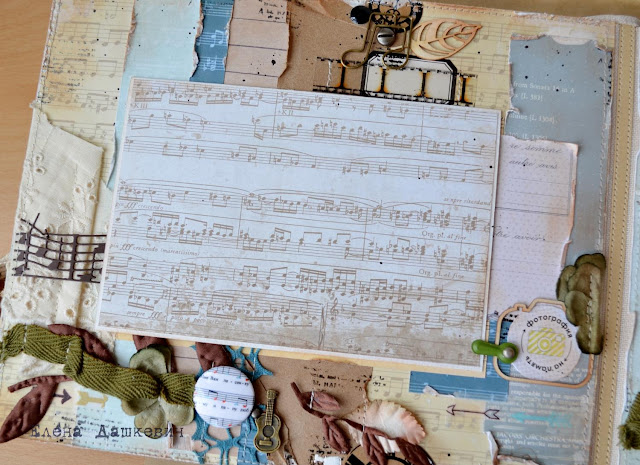 На каждой страничке добавлен эмбоссинг текстовым или нотным штампом, шитье, чипборд и брадсы.